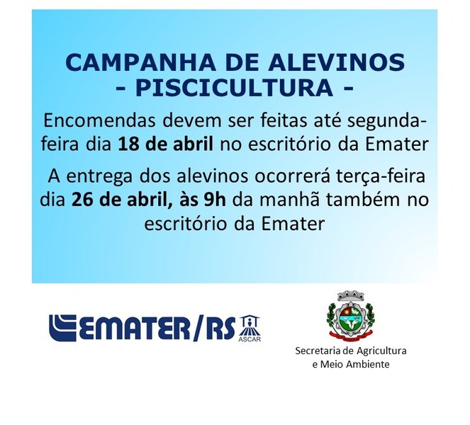 As encomendas são feitas no Escritório da Emater até dia 18 de abril. A entrega ocorrerá dia 26 de abril, aproveitando o período posterior da despesca, tradicional da Semana Santa, para repovoarmos nossos açudes.