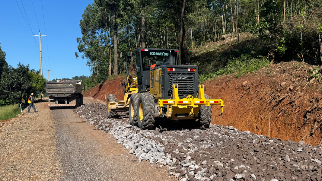 A Prefeitura de Boa Vista do Sul está realizando o preparo da base na comunidade de Trípoli São José, etapa que antecede a aplicação do asfalto no local.